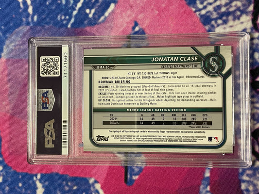 2022 Bowman Mega Box Jonatan Clase Chrome Auto Blue Refractor 63/150 PSA 10