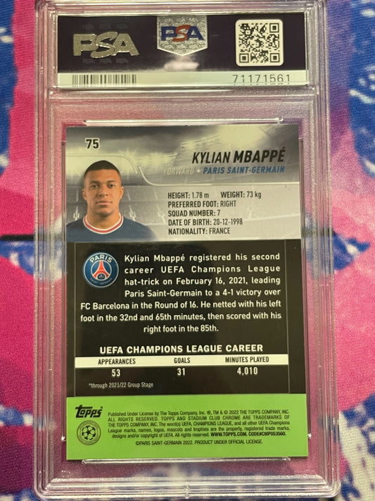 2021-2022 Kylian Mbappe Topps Stadium Club Chrome Blue Prizm Refractor PSA 9